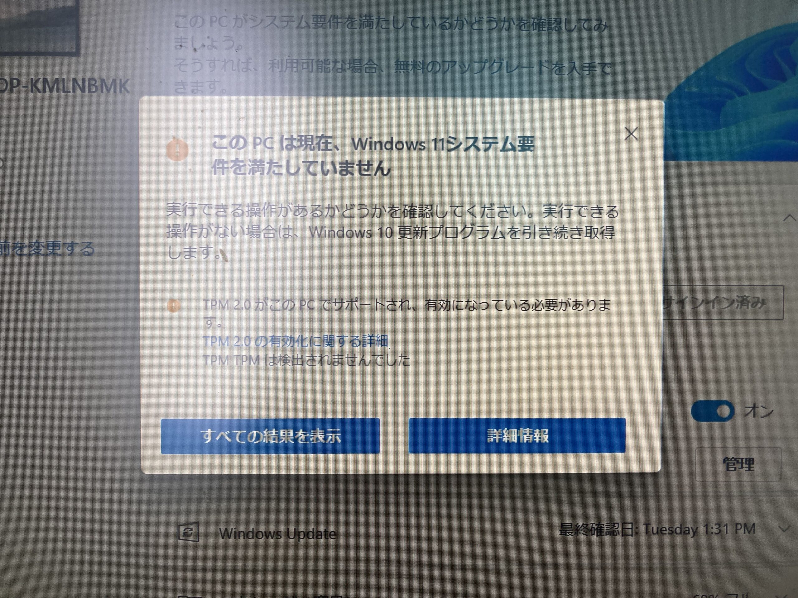 「TPM2.0がこのPCでサポートされ、有効になっている必要があります。」との文言が。