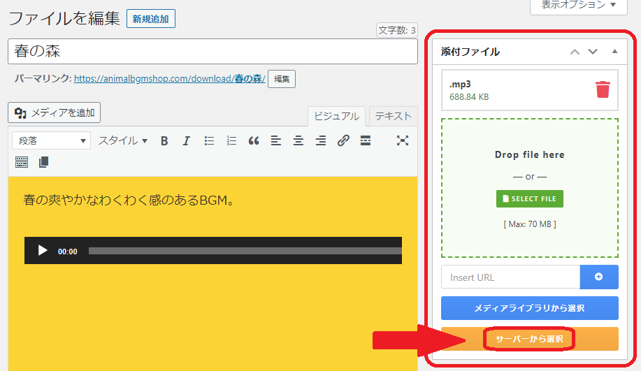 メディアライブラリとは別にサーバーにアップする必要があるので、緑の枠の「Drop file here」に 音源ファイルをドラッグ&ドロップするの方法が確実です。